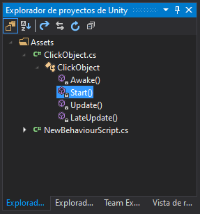 El Explorador de proyectos de Unity muestra todos los archivos y directorios de proyectos de Unity de la misma manera que lo hace el Editor de Unity. Esto es diferente a navegar por los scripts de Unity con el Visual Studio Solution Explorer normal, que los organiza en proyectos y una solución generada por Visual Studio.