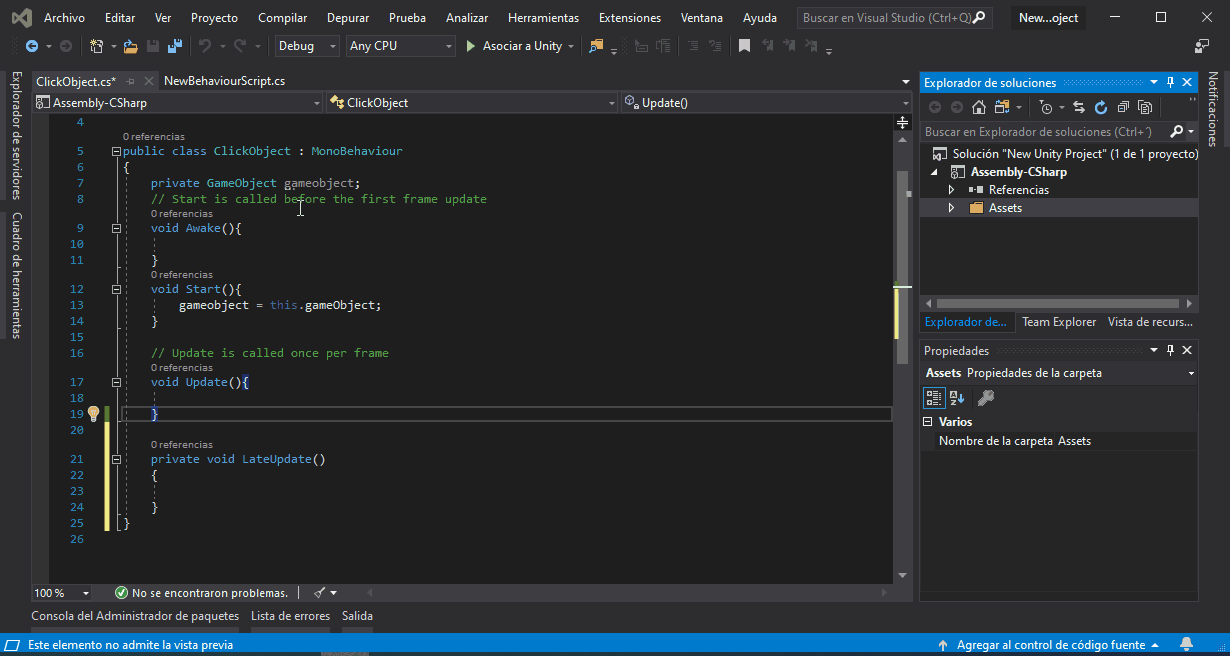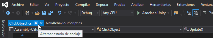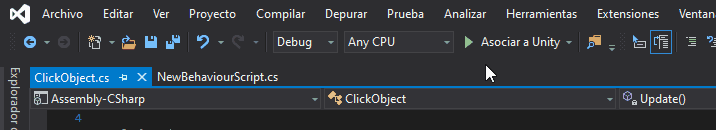 Una vez que ya tenga Unity configurado para trabajar con Visual Studio, de esta forma podremos editar los scripts de Unity con Visual Studio. Para abrirlos solo basta con dar doble clic sobre los archivos.