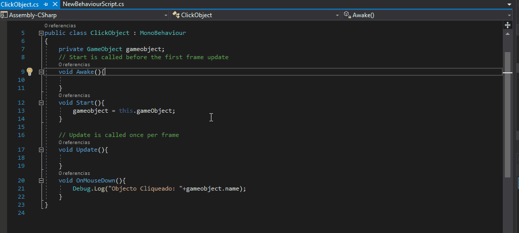2.- Comience a escribir el nombre de un mensaje de Unity, por ejemplo: OnMouseDown